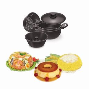1 Caçarola base 1 Forma de pudim 1 Forma de cuscuz também escorredor 1 Tampa.