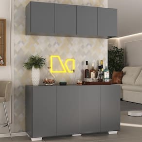 Receba seus convidados com estilo e sofisticação com o Kit Bar Armário Aéreo e Aparador 4 Portas. Fabricado em MDP (15mm) com acabamento acetinado (cerca de 20% de brilho), garante durabilidade e resistência. Composto por um aparador e um armário aéreo com 4 portas e prateleiras, oferece amplo espaço interno para organizar bebidas, copos e outros itens de bar. Seu design clean proporciona um visual moderno que combina com qualquer tipo de decoração. Além disso, o aparador possui pés em polipropileno que oferecem estabilidade e estilo único.