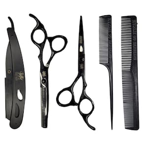 5 - tesoura de cabeleireiro ou barbeiro profissional, indicada para cabeleireiros de beleza, cabeleireiros, amantes e indivíduos de cabelo. Pode ser utilizado para aparar cabelos faciais: barba e pelos do corpo, também indicado para a vida doméstica como o noivo de estimação. Perfeito para quem deseja trabalhar com produto 100% novo e de alta qualidade ferramenta ideal para cabeleireiros e barbeiros. Tesoura com acabamento mais leve e resistente. Sua composição preserva o funcionamento e afiação da tesoura por mais tempo.