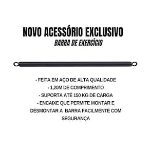 Kit Barra de Exercícios e Ganchos Super Largos Bravus Kit Barra de Exercícios e Ganchos Super Largos Apresentamos o novo Kit Bravus, composto pelos acessórios presentes em nossos melhores kits. Tenha uma academia portátil em suas mãos, melhore o desempenho de seu treino através dos acessórios exclusivos que quando combinados aos elásticos extensores da Bravus permitem que você execute uma infinidade de exercícios para tonificar, definir e fortalecer seu corpo por completo O Kit possui: 1x Barra de Exercícios Seu Kit Mega Bravus possui a exclusiva Barra de Exercícios para ser Utilizado juntamente com a super band de sua escolha. Basta acoplar o gancho do kit na super band e encaixá-lo nas alças localizadas na extremidade da barra. São tantas possibilidades de uso em um só equipamento, que seu treino estará em evolução constante Barra de Exercícios Desmontável, feita em aço reforçado com acabamento externo acolchoado. Resistência, Durabilidade e Conforto A barra de exercícios é fácil de montar e desmontar. Você só precisa conectar as duas partes da barra e ela está pronta para ser Utilizado onde você quiser Ao terminar o treino você pode desconectar às duas partes e guardá-la em sua bolsa de treino, que faz parte do kit. Feita em aço reforçado e suporta até 140kg de carga. Sua estrutura garante a perfeita conexão entre às duas partes da barra, permitindo segurança e equilíbrio durante os movimentos. Conquiste mais força, resistência e definição muscular com o novo Kit Mega Bravus. Dimensões da Barra:106cm de comprimento, 28cm de diâmetro, peso de 1,3kg 2x Ganchos Super Largos Os ganchos do kit foram desenvolvidos especificamente para as Super Bands. Eles se conectam perfeitamente a qualquer modelo de Super Bands Bravus. Marca: Não Informado