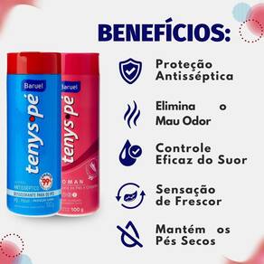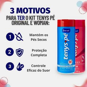 O Kit Baruel Tenys Pé oferece a solução completa para manter seus pés secos, protegidos e livres de odores indesejáveis. Composto por uma unidade do clássico Tenys Pé autêntico 100g e uma unidade do delicado Tenys Pé Woman, este kit é ideal para toda a família, proporcionando uma sensação de frescor e bem-estar ao longo do dia. Desenvolvido para combater eficazmente fungos e bactérias, ele garante pés saudáveis e confortáveis.