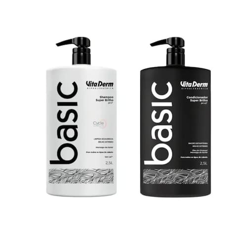 Kit Shampoo Condicionador Pro Basic 2,5L Vita Derm O Pro Basic Shampoo Super Brilho higieniza suavemente os fios. Possui em sua formulção a de Karité, que confere brilho e maciez aos cabelos. Indicado para todos os tipos de cabelo. A de karité , extraída das nozes da árvore de karité nativa da África Ocidental e Central, é um ingrediente valioso na indústria de cosméticos, especialmente em produtos para o cabelo. É rica em ácidos graxos, vitaminas e outros compostos benéficos que conferem diversas vantagens para os cabelos. Aqui estão os principais benefícios da de karité para os cabelos: Hidratação Intensa: Penetra profundamente nos fios, mantendo-os macios e prevenindo o ressecamento. Proteção Contra Danos: Cria uma barreira que protege o cabelo de poluição, raios UV e calor, preservando seu brilho e elasticidade. Redução do Frizz: Sela a umidade nos fios, diminuindo o frizz e facilitando o pentear, ideal para cabelos cacheados e crespos. Fortalecimento dos Fios: As vitaminas A e E fortalecem os fios, protegendo-os dos radicais livres e promovendo um crescimento saudável. Suavidade e Macies: Amacia e suaviza cabelos secos e danificados. Versatilidade: Adequada para todos os tipos de cabelo, especialmente os secos e danificados. O Pro Basic Condicionador Super Brilho hidrata, condiciona os fios e desembaraça. Possui em sua formulação a Menteiga de Karité, que confere brilho, maciez, penteabilidade e emoliência aos cabelos. Indicado para todos os tipos de cabelo. Óleo de Girassol: Extraído das sementes da planta de Girassol é um ingrediente popular em cosméticos para o cuidado dos cabelos devido à sua composição rica em nutrientes. Hidratação Profunda: Alto teor de ácidos graxos: o óleo de girassol contém uma elevada quantidade de ácido linoleico ômega 6 e ácido oleico ômega 9 , que são excelentes para hidratar o cabelo, tornando-o mais macio e menos propenso à quebra. Retenção de Umidade: Ele ajuda a selar a umidade nos fios, prevenindo a desidratação e o ressecamento, especialmente em climas secos ou frios. Marca: Não Informado