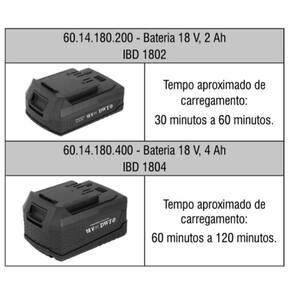 Kit composto de 1 Bateria 18V 4Ah DWT + 1 Carregador de Bateria DWT - Bateria 18V lítio 4 Ah IBD 1804 DWT linha intercambiável Bateria de íons de lítio, garantindo alta eficiência de operação. Possui indicador de nível de carga. Os três LEDs vermelhos indicam o status de carga da bateria. Um LED aceso: indica baixa carga; dois LEDs acesos: metade da carga; e três LEDs acesos: bateria carregada. Possui entrada de ar para sistema de refrigeração, base emborrachada que ajuda a prevenir riscos em superfícies e absorver impactos leves. Indicada para a linha de ferramentas a bateria intercambiável DWT. Carregadores indicados: carregador de bateria 18 V ICBD 1805 6014180500 ou carregador de bateria carga rápida 18 V ICBD 1806 6014180600 . legal: 90 dias + contratual: 9 meses DETALHES TÉCNICOS Modelo:ibd1804 Tipo de bateria:Íons de lítio Tensão V :18 V Capacidade da bateria A :4,0 Ah Indicador de bateria fraca:Sim Massa aproximada peso :0,71 kg- - Carregador de bateria DWT Carregador de bateria 18 V, linha intercambiável, carregamento convencional, ICBD 1805, DWT 1 Carregador de bateria. Bivolt automático. Indicado para carregar as baterias modelos IBD 1802 e IBD 1804, da linha intercambiável DWT. Tempo de carregamento aproximado : bateria de 2,0 Ah - 1 hora / bateria de 4,0 Ah - 2 horas. Carregador com carregamento convencional. legal: 90 dias + contratual: 9 meses Para locadoras, única e exclusiva de 90 dias DETALHES TÉCNICOS Modelo:icbd 1805 Tensão de entrada do carregador de baterias:100 V - 240 V - Bivolt automático Frequência:50 Hz/60 Hz Tipo:carregamento convencional Tensão de saída do carregador de bateria:20 V Corrente de saída do carregador de bateria:2,3 A Tempo de carregamento:Bateria de 2.0ah - 60 minutos; Bateria de 4.0ah - 120 minutos Massa aproximada peso :0,444 kg Ean: 7908481207808