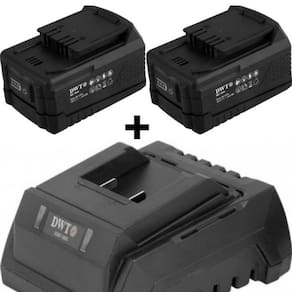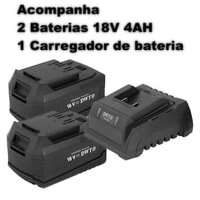 Kit composto de 2 Baterias 18V 4Ah DWT + 1 Carregador de Bateria DWT - Bateria 18V lítio 4 Ah IBD 1804 DWT linha intercambiável Bateria de íons de lítio, garantindo alta eficiência de operação. Possui indicador de nível de carga. Os três LEDs vermelhos indicam o status de carga da bateria. Um LED aceso: indica baixa carga; dois LEDs acesos: metade da carga; e três LEDs acesos: bateria carregada. Possui entrada de ar para sistema de refrigeração, base emborrachada que ajuda a prevenir riscos em superfícies e absorver impactos leves. Indicada para a linha de ferramentas a bateria intercambiável DWT. Carregadores indicados: carregador de bateria 18 V ICBD 1805 6014180500 ou carregador de bateria carga rápida 18 V ICBD 1806 6014180600 . Garantia legal: 90 dias + Garantia contratual: 9 meses DETALHES TÉCNICOS Modelo:ibd1804 Tipo de bateria:Íons de lítio Tensão V :18 V Capacidade da bateria A :4,0 Ah Indicador de bateria fraca:Sim Massa aproximada peso :0,71 kg- - Carregador de bateria DWT Carregador de bateria 18 V, linha intercambiável, carregamento convencional, ICBD 1805, DWT 1 Carregador de bateria. Bivolt automático. Indicado para carregar as baterias modelos IBD 1802 e IBD 1804, da linha intercambiável DWT. Tempo de carregamento aproximado : bateria de 2,0 Ah - 1 hora / bateria de 4,0 Ah - 2 horas. Carregador com carregamento convencional. Garantia legal: 90 dias + Garantia contratual: 9 meses Para locadoras, garantia única e exclusiva de 90 dias DETALHES TÉCNICOS Modelo:icbd 1805 Tensão de entrada do carregador de baterias:100 V - 240 V - Bivolt automático Frequência:50 Hz/60 Hz Tipo:carregamento convencional Tensão de saída do carregador de bateria:20 V Corrente de saída do carregador de bateria:2,3 A Tempo de carregamento:Bateria de 2.0ah - 60 minutos; Bateria de 4.0ah - 120 minutos Massa aproximada peso :0,444 kg Ean: 7908481207792