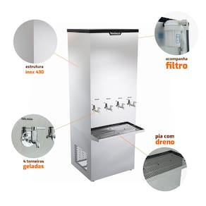 Especificações Bebedouro: - Capacidade: 200 Litros; - Modelo: BI200; - Revestimento Interno do Tanque: Polipropileno; - Refrigeração: Gás refrigerante R-134a; - Quantidade de Torneiras: 4 torneiras, todas geladas; - Isolamento Térmico: Poliuretano injetado; - Pia: Aço inox 430, com dreno; - Serpentina Interna: Aço inox 304; - Acessórios Inclusos: Filtro de 5 e mangueira; - Termostato: 7 níveis de regulagem; - Pés: Com regulagem de altura; - Revestimento Externo: Aço inox 430 brilhoso; - Tensão: 220V; - Corrente: 2,1 A; - Sistema: Compressor; - Potencia: 1/6HP; - Garantia: 6 meses; - Altura: 1695 mm; - Largura: 615 mm; - Profundidade: 735 mm; - Peso Líquido: 48 kg; - Peso Bruto: 64 kg; - Medidas da embalagem:182cm A x 69 cm L x 78cm P; ;