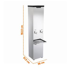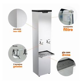 Especificações Bebedouro: - Modelo com 2 torneiras; - Revestimento interno do tanque em polipropileno; - Refrigeração através de gás refrigerante R-134a; - Isolamento térmico em poliuretano injetado; - Pia em aço inox 430, com dreno; - Serpentina interna em aço inox 304; - Acompanha filtro 5 e mangueira; - Termostato com 7 níveis de regulagem; - 4C no nível 7; - Pés com regulagem de altura; - Ideais para ambientes com grande circulação de pessoas; - Fácil instalação; - Revestimento externo em aço inox 430 brilhoso; - Tensão: 220V monofásico; - Sistema: Compressor; - Potência: 1/10HP; - Corrente: 2,1 A; - Medidas totais: 162,5cm A x 36cm L x 51,5cm P; - Medidas da embalagem: 178cm A x 47cm L x 46cm P; - Peso Líquido: 32kg; - Peso Bruto: 45kg;