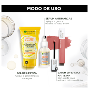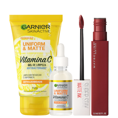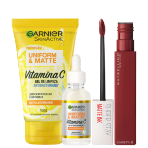O Kit Beleza na Web Garnier Uniform & Maybelline Superstay Matte Ink 50 possui dois produtos faciais indispensáveis para a sua rotina de skincare, o Sérum Garnier Uniform & Matte Vitamina C reduz as marca na pele graças a ação antioxidante da vitamina C e o Gel de Limpeza Garnier Uniform & Matte Vitamina C, que oferece uma limpeza profunda promovendo uma pele uniforme e hidratada. Além disso, o kit também conta com o famoso batom líquido Maybelline Superstay Matte Ink, com cor vibrante e duração de até 16 horas com conforto, sem borrar ou transferir.