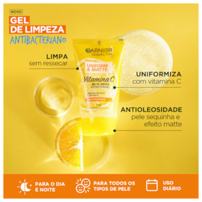 Garnier Uniform & Matte Vitamina C - Gel de Limpeza 150ml: limpa profundamente a pele, sem ressecar e controlando a oleosidade.