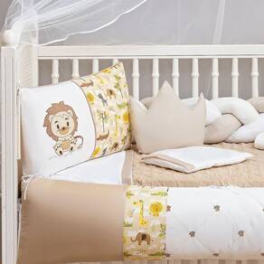 Kit Berço Americano Completo Unisex 14 Peças Leão EdredomTotal 14 Peças1 Edredom 130cm x 75cm1 Cabeceira 0.60 X 0.401 Lateral 1.28 X 0.251 Trança 1.28 X 0.121 Fronha 0,28 x 0,381 Lençol de Cima com Bainha1 Bando do mosqueteiro 1.40 x 0.201 Mosqueteiro 4.50 x 1.501 Almofada 0.40 x 0.301 Trocador 0,60 x 0,451 SAIA BOX 1,30 x 0,70 x 0,301 lençol de cima 1,20m x 0,80 cm.1 Protetor impermeável para berço americano 1,30m X 0,80cm.1 Travesseiro 0,30cm x 0,40COMPOSIÇÃO:Tecido estampado: 100% algodão.Tecido colorido: 100% poliéster.Tecido lençol : 50% algodão 50% poliéster.Tule : 100% poliamida.Plástico: 100% PVC.Enchimento: 100% poliéster.Edredom dupla face todo matelado com várias costuras.Laterais e cabeceiras com zíper para facilitar a lavagem de seu produto.