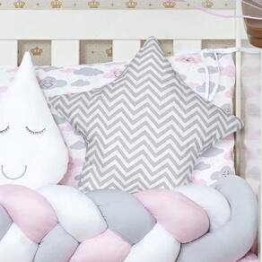 Kit Berço Bebê Nuvem Rosa Tranca 12 Peças Com Saia E Lençol Contém na embalagem: 1 edredom 1,30 m x 0,75 cm 1 almofada nuvem 0,40 cm x 0,20 cm 1 cabeceira 0,57 cm x 0,37 cm 1 lateral 1,25 m x 0,25 cm 1 trança 1,25 m x 0,12 cm 1 lençol de cima 1,30 m x 0,90 cm 1 fronha 0,28 cm x 0,38 cm 1 bandô de mosqueteiro 1,40 m x 0,20 cm 1 mosqueteiro 4,50 m x 1,50 m 1 almofada de gota 1 saia box 1,30 m x 0,70 cm. 1 almofada formato estrela; Observação: Kit de berço que serve em berços padrão nacional e americano Possui zíper para retirar os enchimentos Tecido de qualidade Composição: Tecido estampado: 100% algodão Tecido liso: 50% poliéster / 50% algodão Enchimento = 100% poliéster Mosquiteiro = 100% poliamida
