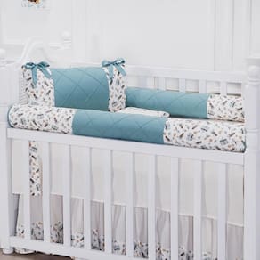 Com seus rolinhos todo estampado, jogo de lençóis e cabeceira com detalhes nervurados, deixando o berço moderno.