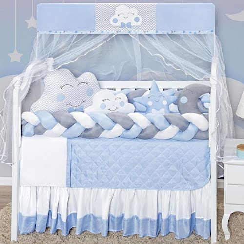 Kit Berço Com Duas Tranças Laterais Cabeceira Nuvem Azul 12P