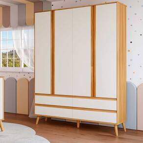 O guardaroupa infantil Theo, com 4 portas e 4 gavetas, é ideal para manter tudo organizado. Seu interior é funcional e espaçoso, com cabideiros metálicos, prateleiras, sistema antitombamento, corrediças telescópicas e dobradiças slow motion que garantem durabilidade e facilidade de uso. Os puxadores tipo cava em MDF e o revestimento interno com efeito linho complementam o visual sofisticado do móvel.