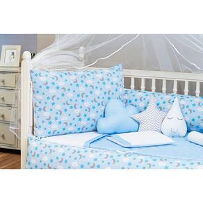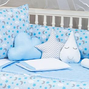 Esse kit é composto por 13 peças, todas pensadas com muito carinho para proporcionar conforto e segurança ao seu pequeno. Inclui uma cabeceira, duas laterais, um lençol de cima, uma fronha, um bando do mosquiteiro, um mosquiteiro, uma almofada nuvem, uma almofada gota, uma almofada estrela, uma saia box, um edredom e um trocador.
