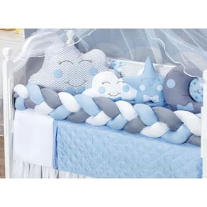 Kit berço nuvem azul masculino com trança lateral 12 peças Kit berço nuvem 12 peças Atenção este é o melhor e mais completo kit berço do mercado Total 12 peças 1 cabeceira------------------0.60x0.40 mts 1 tranças -----------------------1.25x0.0,12mts 1 laterais -----------------------1.25x0.25mts 1 lençol de cima ------------1.30x0.70 mts 1 fronha ---------------------0.28x0.38 mts 1 bando do mosqueteiro---1.40x0.20 mts 1 mosqueteiro---------------4.50x1.50 mts 1 almofada nuvem --------0.40x0.20 mts 1 almofada lua ----------0,30 x 0,22 mts 1 almofada estrela---- 0,30 x 0,30 mts 1 saia box -------------1,30 x 0,70 x 0,30 mts 1 edredom--------------------130cm x 75cm Descrição das peças:Tecido estampado: 100% algodão Tecido liso: 50% algodão 50% poliésterEnchimento 100% poliésterMosqueteiro 100% poliamida Informações importantes:O produto já vai pronto para o uso, com o enchimento já incluso.Acompanha as peças conforme a descrição, não esta incluso o berçoA cabeceira e as laterais do kit possuem zíper para retirar o enchimento, facilitando assim uma possível lavagem do produto.