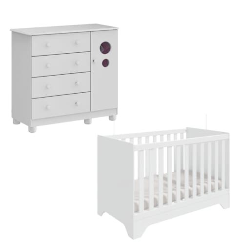 A Cômoda Bolinha Infantil complementa o kit oferecendo organização prática no dia a dia. Possui 4 gavetas com corrediças telescópicas ,Porta com PETG cristal, ideal para roupas, brinquedos e acessórios. Equipada com sistema antitombamento e pés reguláveis em ABS, une segurança e funcionalidade com acabamento branco.