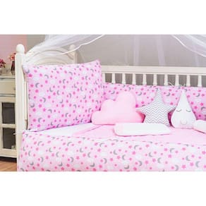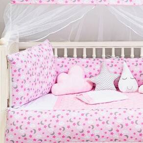 Leia atentamente a descrição do anúncio, este kit acompanha 8 peças conforme citadas abaixo, não acompanha todas as peças da foto.Total 8 peças____________________________________________________________1 cabeceira------------------0.60x0.40 mts2 laterais -----------------------1.25x0.25mts1 bando do mosqueteiro---1.40x0.20 mts1 mosqueteiro---------------4.50x1.50 mts1 almofada nuvem --------0.40x0.20 mts1 almofada gota ----------0,30 x 0,22 mts1 almofada estrela---- 0,30 x 0,30 mts____________________________________________________________Descrição das pecas :Tecido estampado: 100% algodãoTecido liso: 50% algodão| 50% poliésterEnchimento 100% poliésterMosqueteiro 100% poliamidaInformações importantes:O produto já vai pronto para o uso, com o enchimento já incluso.Acompanha as peças conforme a descrição, não esta incluso o berçoA cabeceira e as laterais do kit possuem zíper para retirar o enchimento, facilitando assim uma possível lavagem do produto. Marca: L2m