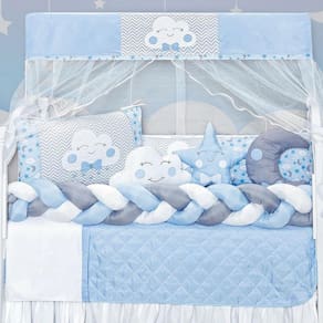 Kit Protetor Berço Completo Trançado Nuvem Estrela Lua Com Naninha 13 peçasTOTAL 13 PEÇAS:1 Cabeceira------------------0.65X0.35 mts1 Lateral -----------------------1.25X0.25mts 1 Trança --------------------1.25X0.12 mts1 Lençol de cima ------------1.30X0.70 mts 1 Fronha ---------------------0.28x0.38 mts 1 Bando do mosqueteiro---1.40x0.20 mts1 Mosqueteiro---------------4.50x1.50 mts1 Edredom-------------------1.30X0.75 mts1 SAIA BOX -------------1,30 x 0,70 x 0,30 mts1 Almofada nuvem --------0.40x0.20 mts1 Almofada Lua ----------0,22 x 0,22 mts1 Almofada ESTRELA -------0,30 x 0,30 mts1 Naninha Descrição das peças :Tecido estampado 100% algodãoTecido liso 100% poliésterEnchimento 100% poliésterMosqueteiro 100% poliamidaInformações Importantes:O produto já vai pronto para o uso, com o enchimento já incluso.Acompanha as peças conforme a descrição, não esta incluso o Berço.Cabeceira e Lateral possuem zíper para retirada do enchimento.Trança NÃO deve ser lavada na máquina Marca: L2m