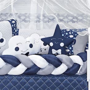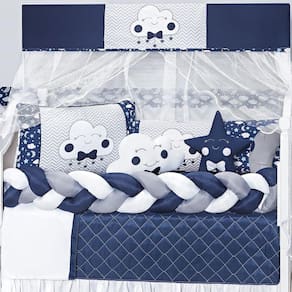 Kit Protetor Berço Completo Trançado Nuvem Estrela Lua Com Naninha 13 peçasTOTAL 13 PEÇAS:1 Cabeceira------------------0.65X0.35 mts1 Lateral -----------------------1.25X0.25mts 1 Trança --------------------1.25X0.12 mts1 Lençol de cima ------------1.30X0.70 mts 1 Fronha ---------------------0.28x0.38 mts 1 Bando do mosqueteiro---1.40x0.20 mts1 Mosqueteiro---------------4.50x1.50 mts1 Edredom-------------------1.30X0.75 mts1 SAIA BOX -------------1,30 x 0,70 x 0,30 mts1 Almofada nuvem --------0.40x0.20 mts1 Almofada Lua ----------0,22 x 0,22 mts1 Almofada ESTRELA -------0,30 x 0,30 mts1 Naninha Descrição das peças :Tecido estampado 100% algodãoTecido liso 100% poliésterEnchimento 100% poliésterMosqueteiro 100% poliamidaInformações Importantes:O produto já vai pronto para o uso, com o enchimento já incluso.Acompanha as peças conforme a descrição, não esta incluso o Berço.Cabeceira e Lateral possuem zíper para retirada do enchimento.Trança NÃO deve ser lavada na máquina Marca: L2m