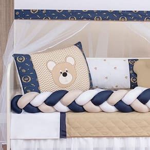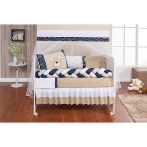 Kit Berço Trança Completo Baby Bege 12 PeçasTotal 12 peças1 cabeceira------------------0.60x0.40 mts1 lateral -----------------------1.25x0.25mts1 trança --------------------1.25x0.12 mts1 lençol de cima ------------1.30x0.90 mts ------ 100% algodão1 fronha ---------------------0.28x0.38 mts ------ 100% algodão1 Refil de travesseiro----------0.28x0.38 mts 1 bando do mosqueteiro---1.40x0.20 mts1 mosqueteiro---------------4.50x1.50 mts1 edredom-------------------1.30x0.75 mts1 almofada nuvem --------0.40x0.30 mts1 trocador -----------------0,60 x 0,40 mts1 saia box -------------1,30 x 0,70 x 0,30 mtsCor BegeObservações:- produto com excelente qualidade de tecido e acabamento.- possui zíper para remoção dos enchimentos.Descrição das pecas :Tecido estampado: 100% algodãoTecido liso: 50% algodão| 50% poliésterLençol: 100% algodãoFronha: 100% algodãoEnchimento 100% poliésterMosqueteiro 100% poliamidaInformações importantes:O produto já vai pronto para o uso, com o enchimento já incluso.Acompanha as peças conforme a descrição, não esta incluso o berçoA cabeceira e as laterais do kit possuem zíper para retirar o enchimento, facilitando assim uma possível lavagem do produto.Kit para berço padrão Americano e Nacional Marca: L2m