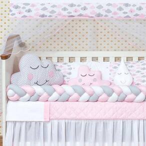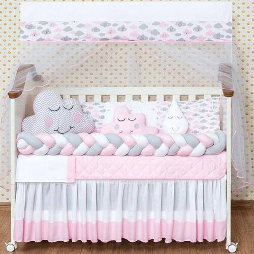 TOTAL 11 PEÇAS1 Cabeceira------------------0.57X0.37 mts1 Lateral -----------------------1.25X0.25mts1 Trança --------------------1.25X0.12 mts 1 Lençol de cima ------------1.30X0.90 mts ------ 100% ALGODÃO1 Fronha ---------------------0.28x0.38 mts ------ 100% ALGODÃO1 Bando do mosqueteiro---1.40x0.20 mts1 Mosqueteiro---------------4.50x1.50 mts1 Edredom-------------------1.30X0.75 mts1 Almofada nuvem --------0.40x0.20 mts1 Almofada Gota ----------0,30 x 0,22 mts1 SAIA BOX -------------1,30 x 0,70 x 0,30 mtsDescrição das peças :Tecido estampado 100% algodão Tecido liso 100% poliéster Jogo de lençol tecido 100% ALGODÃO Enchimento 100% poliésterMosqueteiro 100% poliamidaInformações Importantes:O produto já vai pronto para o uso, com o enchimento já incluso.Acompanha as peças conforme a descrição, não esta incluso o BerçoA cabeceira e as laterais do kit possuem zíper para retirar o enchimento, facilitando assim uma possível lavagem do produto. Marca: L2m
