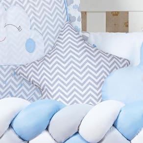 Kit Berço Trançado Com Saia Box E Lençol Menina Nuvem Azul Contém na embalagem: 1 edredom 1,30 m x 0,75 cm 1 almofada nuvem 0,40 cm x 0,20 cm 1 cabeceira 0,57 cm x 0,37 cm 1 lateral 1,25 m x 0,25 cm 1 trança 1,25 m x 0,12 cm 1 lençol de cima 1,30 m x 0,90 cm 1 fronha 0,28 cm x 0,38 cm 1 bandô de mosqueteiro 1,40 m x 0,20 cm 1 mosqueteiro 4,50 m x 1,50 m 1 almofada de gota 1 saia box 1,30 m x 0,70 cm. 1 almofada formato estrela; Observação: Kit de berço que serve em berços padrão nacional e americano Possui zíper para retirar os enchimentos Tecido de qualidade Composição: Tecido estampado: 100% algodão Tecido liso: 50% poliéster / 50% algodão Enchimento = 100% poliéster Mosquiteiro = 100% poliamida Ean: 7710334720897