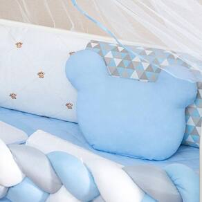 A cabeceira e as laterais possuem zíper, facilitando a retirada do enchimento para uma possível lavagem do produto. O enchimento é feito de poliéster, proporcionando maciez e conforto para o bebê.