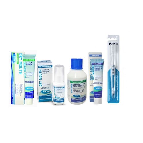 O kit inclui cinco produtos de alta qualidade: - Bioxtra creme dental 50g: Esse creme dental exclusivo contém uma fórmula patenteada que hidrata a boca e ajuda a simular a ação da saliva natural. Sua fórmula é isenta de açúcar e não contém álcool, garantindo uma limpeza suave e eficaz. - Bioxtra gel hidratante bucal 40mL: Esse gel hidratante é perfeito para aliviar o desconforto causado pela boca seca. Sua fórmula exclusiva proporciona hidratação intensa e refrescância imediata. - Bioxtra spray bucal 50mL: O spray bucal Bioxtra é ideal para levar sempre com você. Ele oferece hidratação instantânea e refrescância duradoura, garantindo uma sensação de alívio imediato. - Bioxtra enxaguatório bucal 250mL: Esse enxaguatório bucal é formulado com ingredientes ativos que ajudam a hidratar a boca e a simular a ação da saliva natural. Sua fórmula suave e livre de álcool proporciona uma sensação de frescor e limpeza. - Escova de dentes importada da marca Pharmakin com cerdas extras suaves: Essa escova de dentes é perfeita para quem possui boca seca e sensível. Suas cerdas extras suaves garantem uma escovação suave e eficaz, sem causar desconforto.