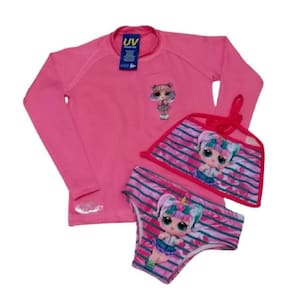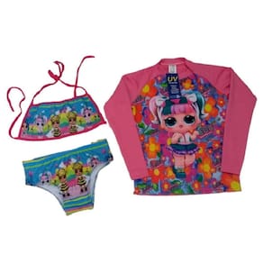 Que tal um belo kit composto por biquini infantil e blusa de proteção, com o tema dos personagens mais divertidos?!Blusa manga longa com decote redondo e estampa de personagens.