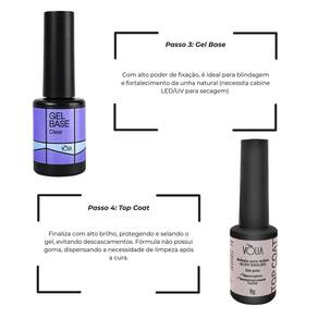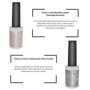 Características Principais: Desidratador: - Ação desengordurante profunda; - Remove oleosidade natural das unhas; - Essencial para melhor fixação dos produtos; - Não é necessário cabine para secagem. Primer sem Ácido: - Sem ácido; - Aumenta a aderência entre unha e gel; - Dermatologicamente testado; - Seca naturalmente, sem cabine. Gel Base: - Base resistente e flexível; - Ideal para blindagem e fortalecimento da unha natural; - Transparente, com alto poder de fixação; - Necessita de cabine LED/UV para secagem. Top Coat: - Finalização com alto brilho; - Fórmula sem goma não precisa limpar após a cura ; - Hipoalergênico e testado dermatologicamente; - Protege e sela o gel, evitando descascamentos.