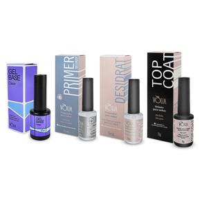 Contém: 01 - Gel Base Clear Alongamento e Esmaltações, 9g, Vlia; 01 - Primer sem Ácido, 10ml, Vlia; 01 - Desidratador Desengordurante Preparador Para Unhas, 9ml, Vlia; 01 - Top Coat Selante Para Unhas, 9g, Vlia.