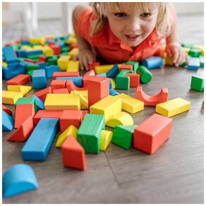 Este conjunto de blocos de madeira é composto por 200 peças em quatro cores diferentes vermelho, amarelo, azul e verde. São nove formatos distintos que permitem uma infinidade de combinações coloridas para seu pequeno construtor empilhar, construir e derrubar. Além disso, o produto promove habilidades motoras finas, destreza, reconhecimento de cores e formas, habilidades matemáticas, coordenação olho mão, contagem e classificação e relações espaciais. O envio deste produto é feito em uma embalagem especial de comércio eletrônico, visando a redução do desperdício e a facilidade de abertura.