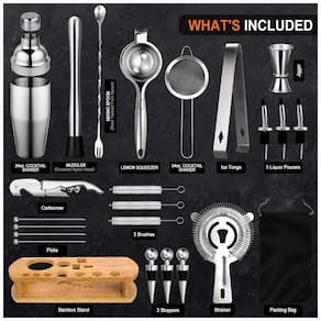Kit de ferramentas de bn o conjunto de coqueteleira profissional inclui uma lata de aço inoxidável de 24 onças Boston que pode conter até três bebidas com uma tampa de coador embutida, misturador de coquetel e colher de mistura, uma ferramenta de medição de tamanho duplo 1, 5 onças, espremedor de limão, pinças de gelo, picaretas, coador, saca rolhas, suporte de bambu e sacos de embalagem, bicas de bebidas com tampa protetora contra poeira e um guia de receitas de coquetéis e mocktails.