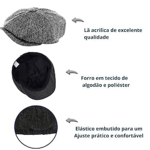 Boina Inglesa: Tecido: 100% Algodão Forro em tecido de algodão Cor: Preto e Branco Tamanho: Único, Ajustável, veste do 56 ao 58 cm; Aba: 6cm