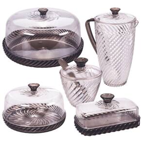 Kit café da manhã e chá da tarde composto por 1 boleira/porta bolo, 1 queijeira/porta queijo, 1 manteigueira/porta manteiga, 1 açucareiro/porta açúcar com colher e 1 jarra de 2L;Os produtos são fabricados em plástico cristal e têm aparência de vidro, sendo o kit composto da seguinte forma:1 Boleira;Material: poliestirenoDimensões: 26cmX26cmX13,5cm (CxLxA)Medidas INTERNAS: 25cm X 10cm (diâmetro X altura)1 Queijeira;Material: poliestirenoDimensões: 18cmX18cmX10,5cm (CxLxA)Medidas INTERNAS: 17cm X 7cm (diâmetro X altura)1 Manteigueira;Material: poliestirenoDimensões: 14,5cmX8,3cmX7,4cm (CxLxA)1 Açucareiro com colher;Material: poliestirenoDimensões: 11,5cmX11,1cmX9,8cm (CxLxA)1 Jarra de 2L;Material: PoliestirenoDimensões: 19,2cmX13,5cmX25,4cm (CxLxA)- Todas as peças deste kit são fabricadas em poliestireno de altíssima qualidade;- Aparência de vidro;- Idêntico ao acrílico;- Material leve e resistente a riscos;- Produtos com toque refinado;- Livres de BPA - BPA Free (não contém bisfenol em sua composição);- Todos os itens do kit são no mesmo tom de transparência e se combinam perfeitamente entre eles;- Kit mais do que exclusivo para quem está montando a casa;- Presente diferenciado e ideal para chá de cozinha;- Fabricante Plasútil;