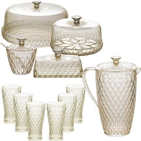 Kit café da manhã e chá da tarde composto por 1 boleira/porta bolo, 1 queijeira/porta queijo, 1 manteigueira/porta manteiga, 1 açucareiro/porta açúcar com colher, 1 jarra de 2L e 6 copos 500ml;Os produtos são fabricados em plástico cristal e têm aparência de vidro, sendo o kit composto da seguinte forma:1 Boleira;Material: poliestirenoDimensões: 26cmX26cmX14cm (CxLxA)Medidas INTERNAS: 25cm X 10cm (diâmetro X altura)1 Queijeira;Material: poliestirenoDimensões: 18cmX18cmX11cm (CxLxA)Medidas INTERNAS: 17cm X 7cm (diâmetro X altura)1 Manteigueira;Material: poliestirenoDimensões: 14,5cmX8,3cmX7,4cm (CxLxA)1 Açucareiro com colher;Material: poliestirenoDimensões: 11,5cmX9,8cmX11,1cm (CxLxA)1 Jarra de 2L;Material: PoliestirenoDimensões: 19,2cmX13,5cmX25,4cm (CxLxA)6 Copos de 500ml;Material: PoliestirenoDimensões: 8,5cmX18cmX9cm (CxLxA)- Todas as peças deste kit são fabricadas em poliestireno de altíssima qualidade;- Aparência de vidro;- Idêntico ao acrílico;- Material leve e resistente a riscos;- Produtos com toque refinado;- Livres de BPA - BPA Free (não contém bisfenol em sua composição);- Todos os itens do kit são no mesmo tom de transparência e se combinam perfeitamente entre eles;- Kit mais do que exclusivo para quem está montando a casa;- Presente diferenciado e ideal para chá de cozinha;- Fabricante Plasútil;