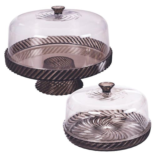 Kit para café da manhã / chá da tarde composto por 1 boleira / porta bolos com pé (C:26,0 x L:26,0 x A:20,0 cm) e 1 queijeira / porta queijo (C:18,0 x L:18,0 x A:10,5 cm). São fabricados em poliestireno (idêntico ao acrílico) e parecem vidro. São leves e resistentes. Todos os produtos são na cor preta e se combinam.Atenção:- Não pode ser levado ao micro-ondas;- Não pode ser lavado na lava-louças;- Sugerimos que a lavagem seja feita com o lado macio da esponja.Fabricante: Plasutil
