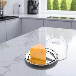Porta Queijos Display: Com base de aço inoxidável e tampa de acrílico transparente, é perfeito para armazenar e servir queijos variados com charme e higiene. Seu design compacto 23cm x 23cm x 9,5cm complementa qualquer ambiente, sendo indispensável para amantes de queijos.