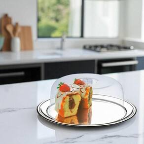 - Material: Aço inox + acrílico - Itens inclusos: 1 Porta Queijos + 1 Porta Bolos - Durabilidade e facilidade de limpeza