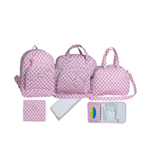 Kit bolsa bebê maternidade com mochila bolsa e frasqueira com bolsos laterais e frontais alças de ombro e de mão kit troca fraldas com : trocador e estojo porta fraldas, lenços umidecidos bolsa 40 x 30 frasqueira 30 x 25 a mochila tem bolso frontal com fechamento em tiras aderentes, 2 bolsos laterais, alças ajustáveis kit é impermeável tecido interno napa sarja polipropileno mochila: 33cm de altura x 27cm de largura x 14cm de espessura