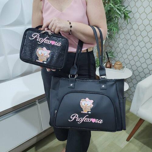 Kit Bolsa e Estojo Box Personalizado Professora Feminina Preto/ Preto Brilho - Coutre Bolsas