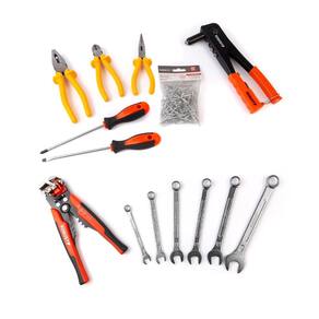 - Composição do kit: 6 chaves combinadas (8, 10, 12, 13, 14, 17 mm); 1 jogo de alicate 3 peças (universal, bico e corte); 1 alicate desencapador de fios automático 8”; 1 alicate rebitador 9,5”; 1 pacote com 100 rebites 4,0 x 12 mm; 1 chave de fenda simples ¼ x 6” (PH2); 1 chave de fenda cruzada ¼ x 6” (PH2); 1 bolsa em lona resistente com alças reforçadas.