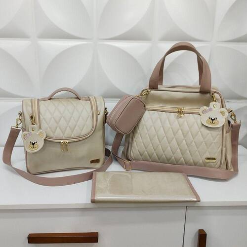 Kit Bolsa Maternidade, Frasqueira Térmica e Trocador Marfim Rose- Coutre Bolsas - Bolsa Maternidade, Frasqueira Térmica e Mini Trocador Menina Marfim Rose - Coutre Bolsas