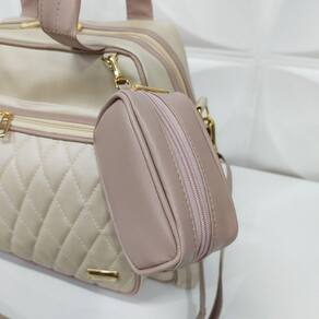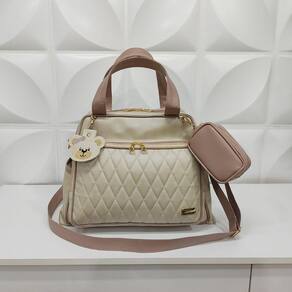 Esse modelo possui um bolso frontal, dois bolsos laterais (cabe copinho de água ou mamadeira) e compartimento principal com fechamento em zíper. Forração interna impermeável e branca de fácil higienização. Possui internamente um bolso de tela para separar os objetos. Alça de mão e alça transversal ajustável.