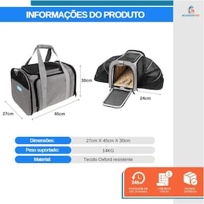 - Bolsa expansível para que seu pet tenha mais espaço; - Confeccionada nas especificações para embarque na cabine de aviões da maioria das companhias aéreas; - Acomoda confortavelmente pets de até 14kg; - Aberturas frontal e lateral que facilitam a entrada e saída do pet; - Fundo interno rígido removível, fácil de higienizar; - Alta qualidade de fabricação e detalhe; - Super arejada, confeccionada com tela de alta resistência nas laterais e topo; - Totalmente dobrável e fácil de guardar.