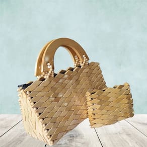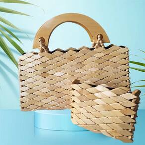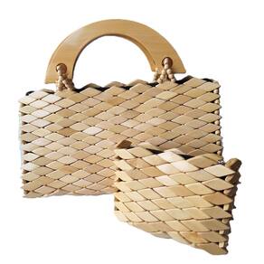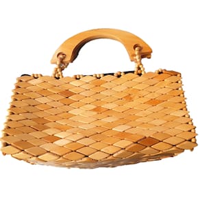 PRODUTO 1: Bolsa Artesanal em Peças de Madeira Envernizada Marfim, Alça Curta, com Zíper e interior em tecido cetim