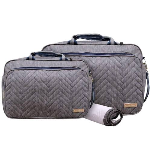 - A Bolsa Grande tem bolsos laterais, bolso frontal com zíper e fechamento principal em zíper.
