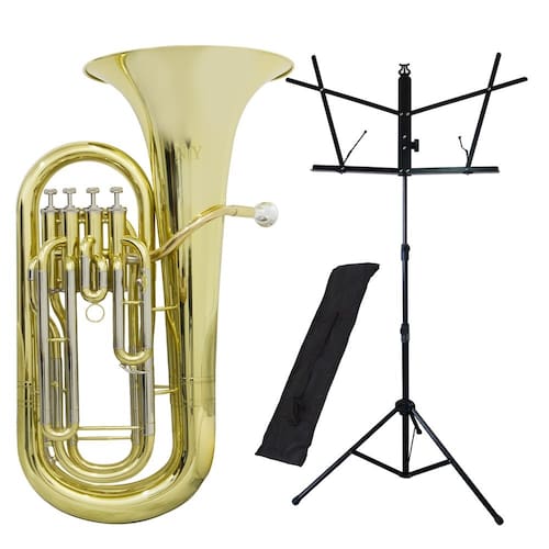 O Bombardino de 4 Pistos (Euphonium) New York é uma excelente opção para quem busca por um som potente em um instrumento de qualidade, com afinação em bb, possui detalhes cromados e pisto em aço inoxidável.Acompanha estante de partitura dobrável com regulagem de altura de 3 estágios. De instalação simples e com sistema de fixação das folhas a estante S1 possui acabamento em epoxi, é compacta e fácil de manusear além de ser resistente, acompanha bag para facilitar o transporte.Especificações- Marca: New York- Modelo: EP 340- Afinação: BB- Diâmetro do Calibre: 14,4 mm- Diâmetro da Campana: 300 mm- Acabamento: Laqueado- Pisto: Aço Inoxidável- Leadpipe: Gold Brass- Acompanha Case Soft- Com detalhes cromados- Medidas Aprox.: 30 x 37 x 68 cm- Peso Aprox.: 3,65 kg Estante- Marca: New York- Modelo: S1- Cor: Preta- Tipo: Estante de partitura tubular- Diâmetros: 16 mm, 12,5 mm e 9,5 mm- Altura máxima: 102 cm- Altura mínima: 52 cm- Tamanho dobrado: 55 cm- Peso Aprox.: 0,750 kgConteúdo da Embalagem- 01 Bombardino De 4 Chaves EP 340 New York- 01 Estante Para Partitura Dobrável S1 New York- 01 Bag- 01 Case- Dimensões da Embalagem (AxLxP): 43 x 57 x 88 cm*imagens meramente Ilustrativas