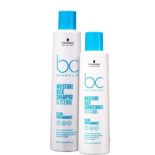 Kit Bonacure Schwarzkopf Shampoo e Condicionador Clean Performance Moisture Kick Home Care Kit com shampoo e condicionador para todos os tipos de cabelo. Schwarzkopf Professional BC Bonacure Clean Performance Moisture Kick Duo oferece tratamento em profundidade e suavidade aos fios. O kit Schwarzkopf Professional BC Bonacure Clean Performance Moisture Kick Duo apresenta fórmula que ajuda a equilibrar o nível ideal de hidratação dos cabelos sem pesar nos fios. Conta com a ação do Glicerol que proporciona uma sensação de cabelo hidratado por até 48 horas. A gama BC Bonacure Clean Performance apresenta uma fórmula clean beauty inovadora, 100% vegan, sem sulfatos, silicones, óleos minerais, microplásticos e corantes artificiais, com um elevado nível de biodegradabilidade; tecnologia avançada com Vegan Care Complex; e embalagens sustentáveis em produtos de rendimento elevado.
