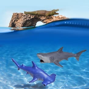 Espécies inclusas no kit:- Crocodilo de Água Salgada (Australiano): O maior réptil do planeta, este superpredador habita manguezais e águas costeiras, sendo capaz de caçar grandes presas com sua força extrema.- Tubarão Branco: Um dos predadores mais famosos dos mares, com sua mandíbula poderosa e instinto apurado, ele domina os topos das cadeias alimentares oceânicas.- Tubarão-Martelo: Reconhecido por sua cabeça em forma de T, essa espécie se destaca por seu excelente campo de visão e comportamento em cardumes, caçando com precisão.